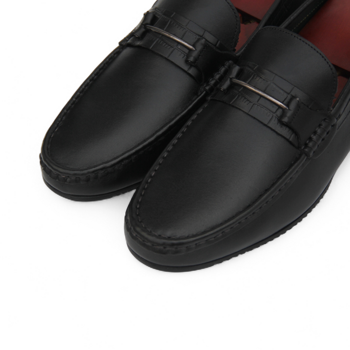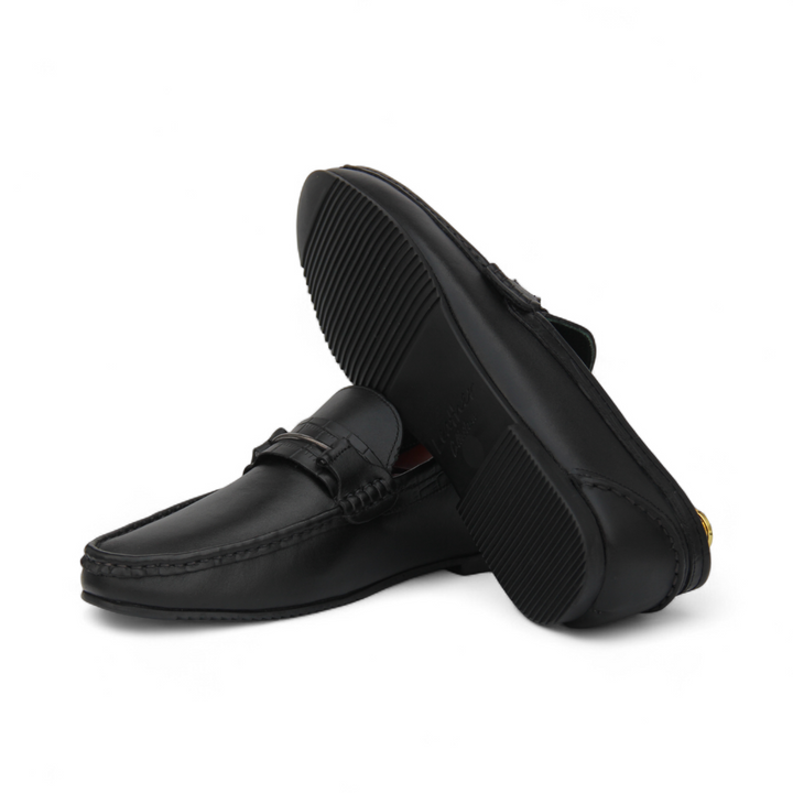 Elevate your style with the Le Sole Black Leather Loafers, crafted from premium genuine leather for a sleek, timeless look. Featuring a smooth black finish, metal bit detail, and cushioned red-lined interior, these loafers blend luxury with all-day comfort. Perfect for both formal and casual wear.