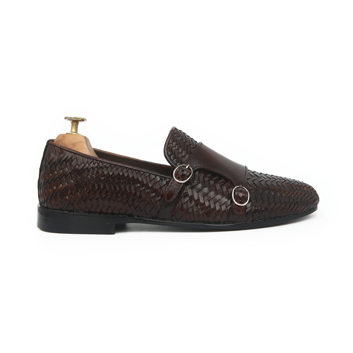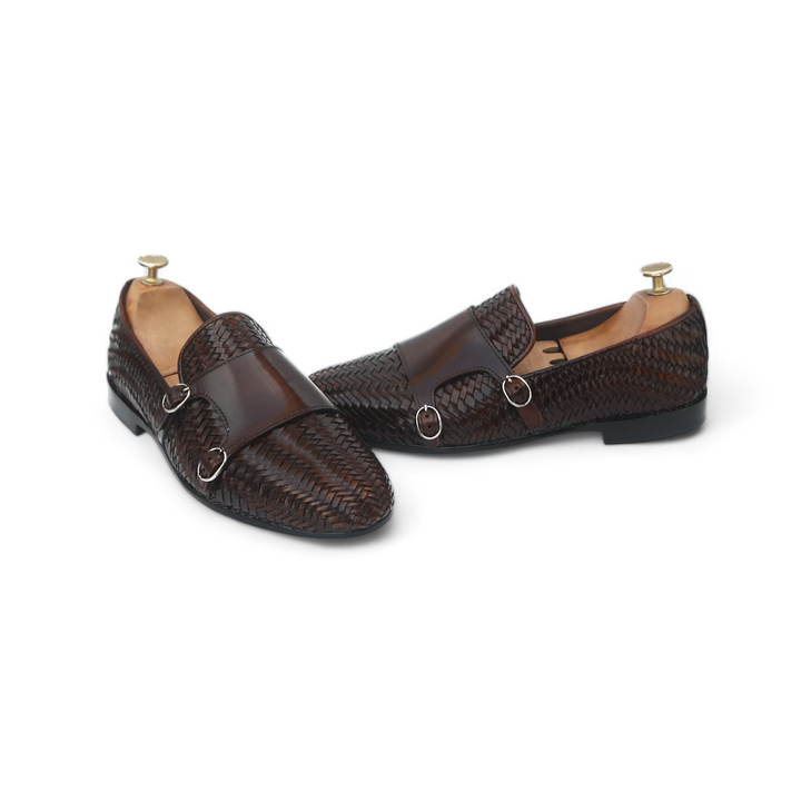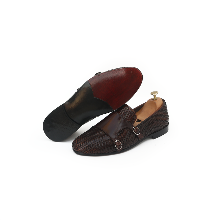 Brown Two Tone Woven leather with hand weaving adorned with monk strap as round shaped slip-ons. Leather Lining on the inside with an all leather cushioned foot bed. Each pair is carefully hand crafted using finest techniques that symbolises the craftsmanship of our brand.