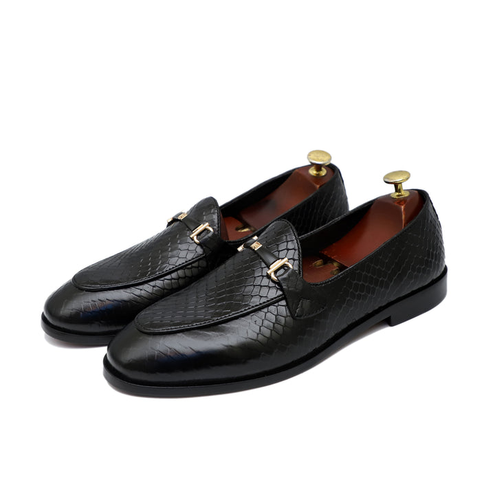 Rs 1,916.66Black textured leather adorned with golden and black buckle as round shaped slip-ons. Leather Lining on the inside with an all leather cushioned foot bed. Each pair is carefully hand crafted using finest techniques that symbolises the craftsmanship of our brand.