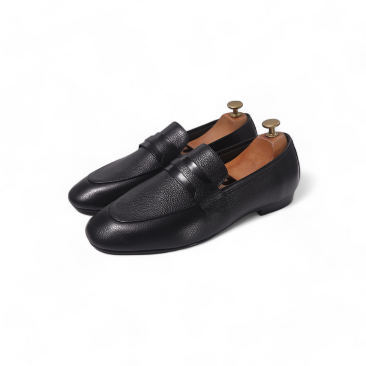Black soft mild leather slip-ons that offer exceptional comfort and flexibility. The supple leather provides a relaxed fit, while the sleek design ensures a sophisticated appearance. Ideal for everyday wear, these slip-ons combine ease of use with a refined style, perfect for both casual and smart-casual settings.