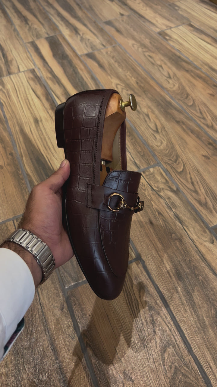 Brown shoes with a printed leather, featuring a durable rubber sole for comfort and grip. The distinctive printed adds a touch of luxury and texture, elevating the classic design. Perfect for adding a stylish edge to both formal and casual outfits, these shoes combine sophistication with practicality.