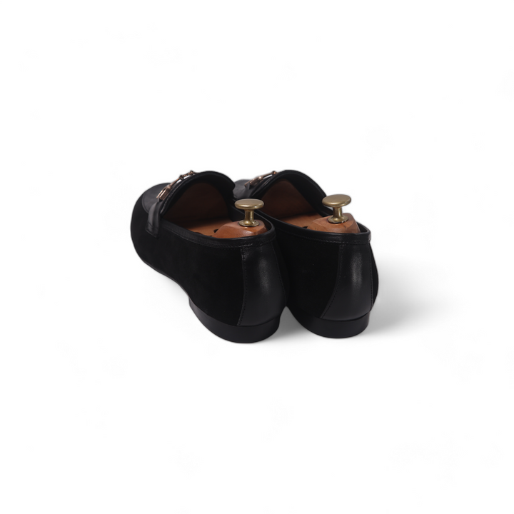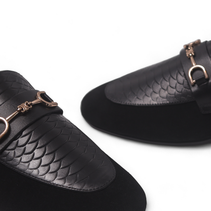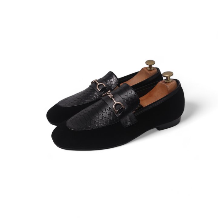 Black shoes with a printed leather, featuring a durable rubber sole for comfort and grip. The distinctive printed adds a touch of luxury and texture, elevating the classic design. Perfect for adding a stylish edge to both formal and casual outfits, these shoes combine sophistication with practicality.