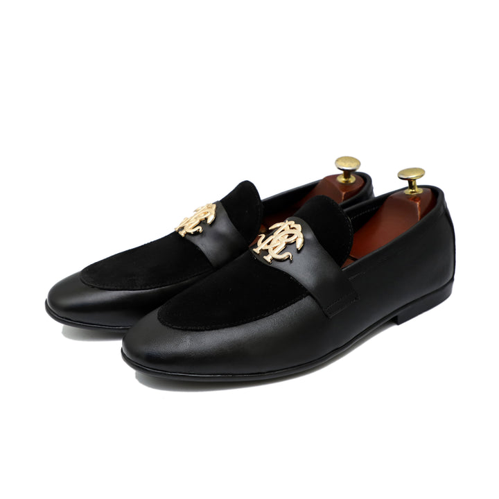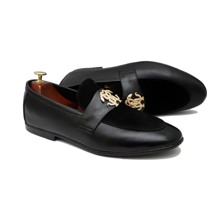 Black leather adorned with golden buckle as round shaped slip-ons. Leather Lining on the inside with an all leather cushioned foot bed. Each pair is carefully hand crafted using finest techniques that symbolises the craftsmanship of our brand.