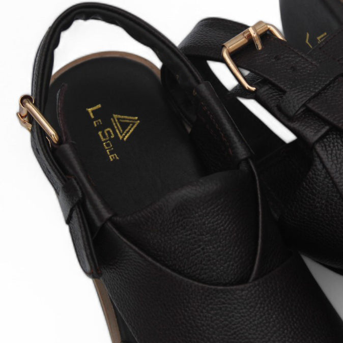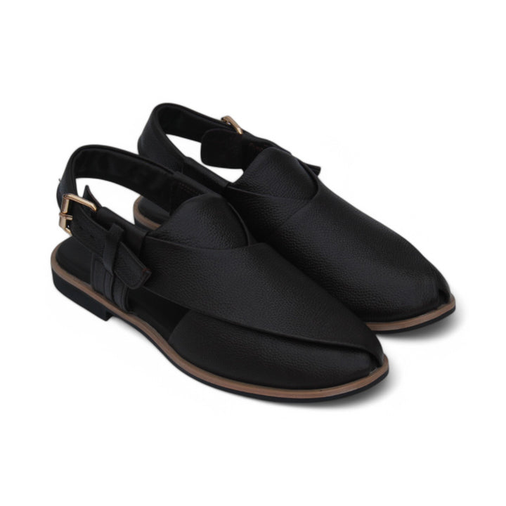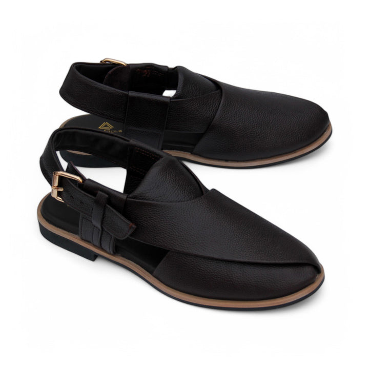A traditional leather Peshawari chappal, known for its comfort and durability, crafted from high-quality leather. This iconic footwear features a sturdy sole and a broad strap design that wraps around the foot, providing a secure fit. The open-toe style allows for breathability, making it ideal for warm climates. The Peshawari chappal is a blend of cultural heritage and timeless style, perfect for both casual and formal wear. Its hand-stitched detailing adds a touch of craftsmanship, making it a classic addition to any wardrobe.