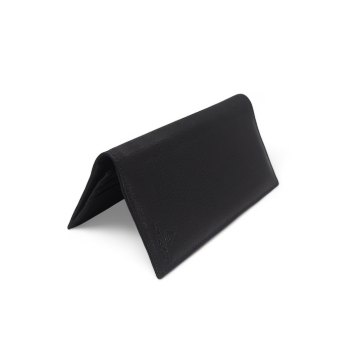 A sleek black leather wallet with a slim design, featuring multiple card slots, a cash compartment, and a secure ID window. Crafted from premium leather with finely stitched edges, it's durable and stylish for any occasion.