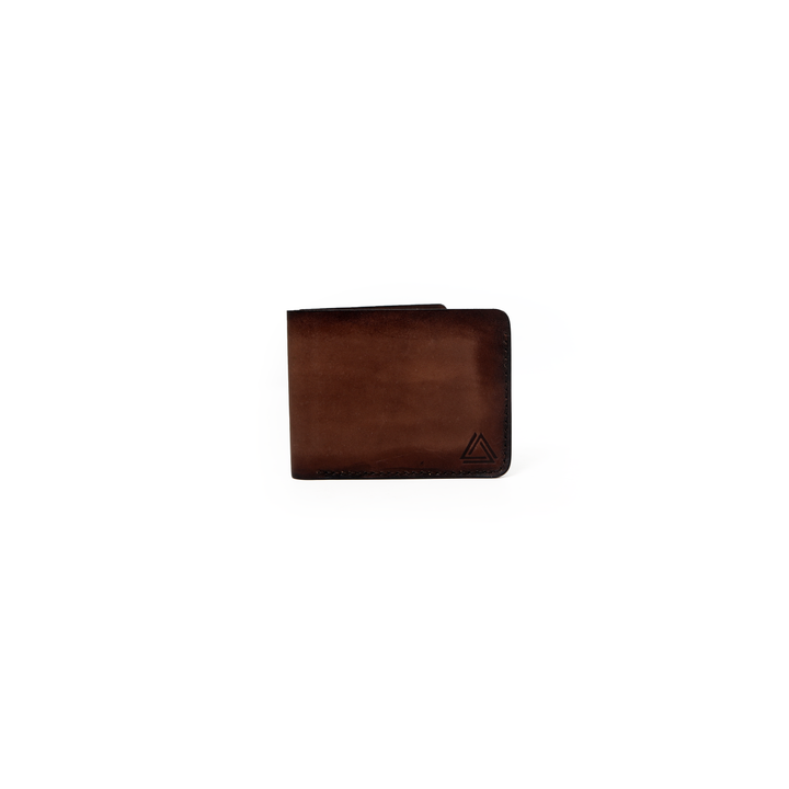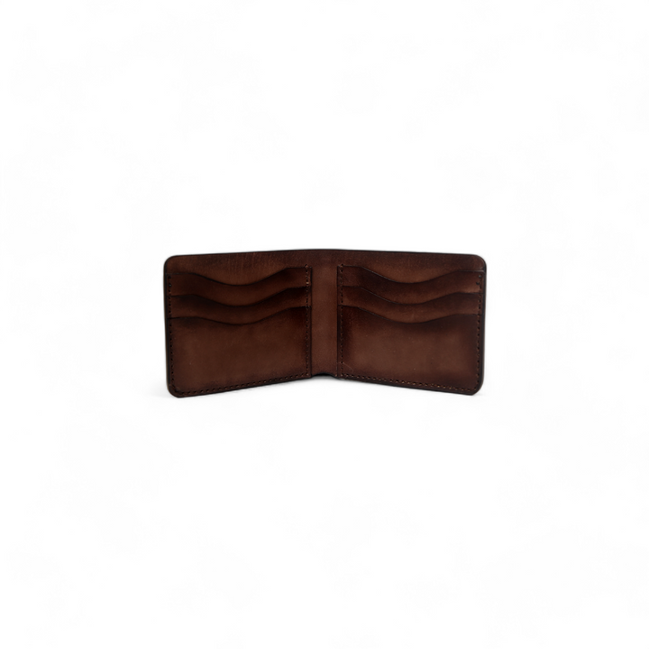 A brown leather wallet with a patina finish that highlights its unique character over time. This wallet offers a classic design with multiple card slots, a cash compartment, and refined stitching. The patina adds a touch of vintage charm, making it both stylish and enduring.