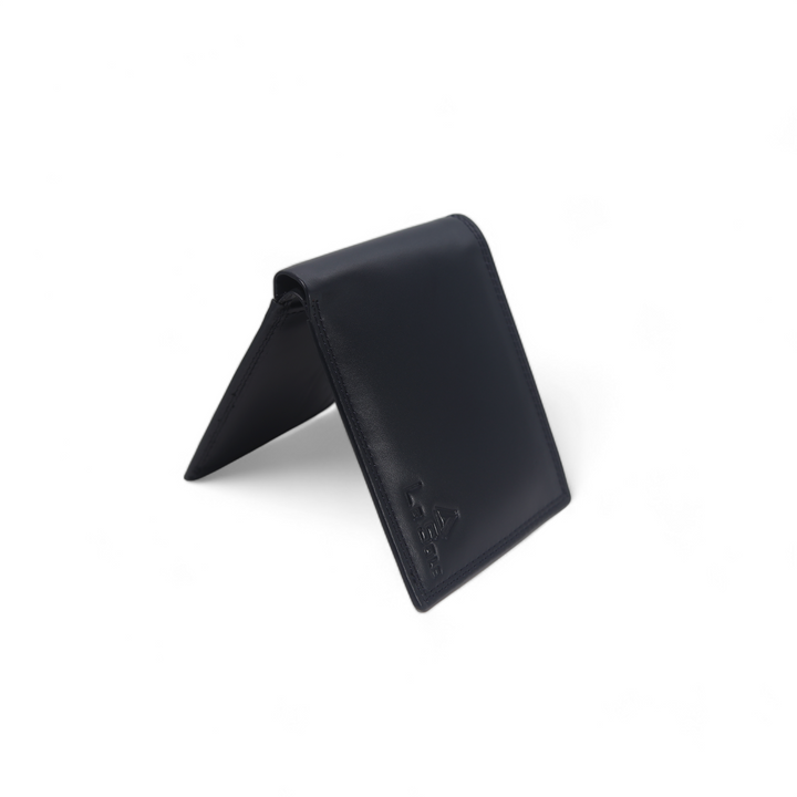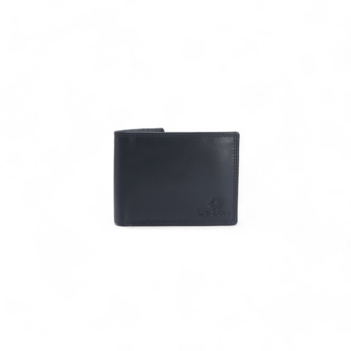A sleek blue leather wallet with a slim design, featuring multiple card slots, a cash compartment, and a secure ID window. Crafted from premium leather with finely stitched edges, it's durable and stylish for any occasion.