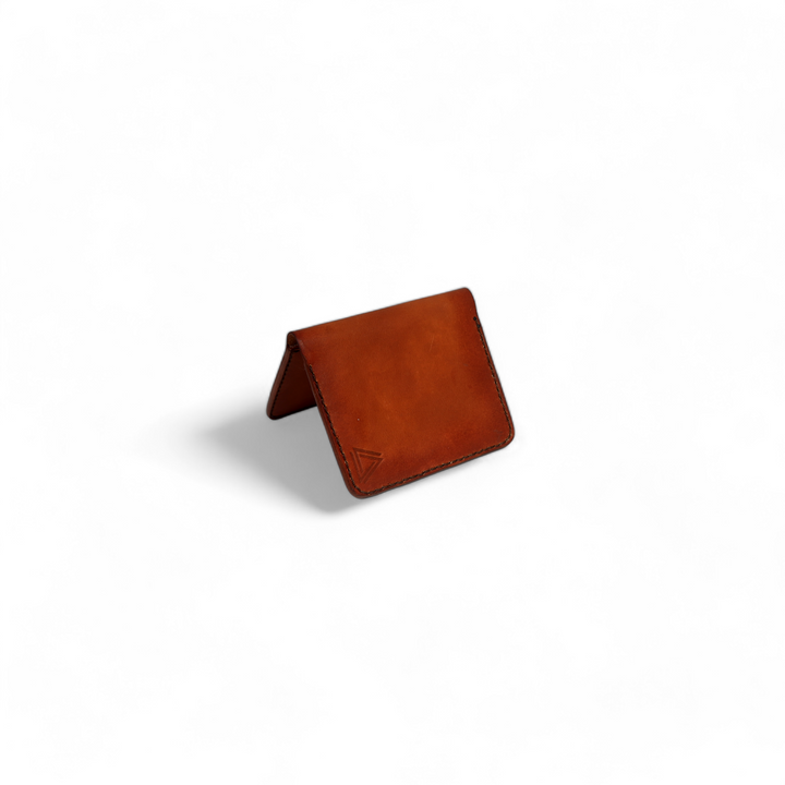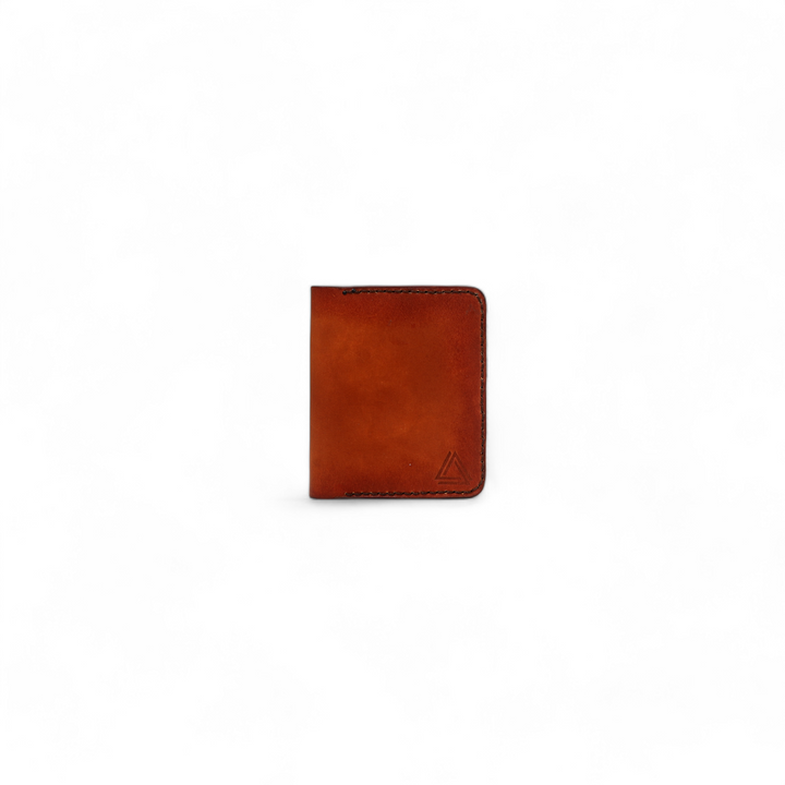 A compact tan card holder wallet with a rich patina finish, showcasing natural aging and character. It features multiple card slots, a sleek design, and finely stitched edges, blending style and function effortlessly. Perfect for those who appreciate timeless elegance.
