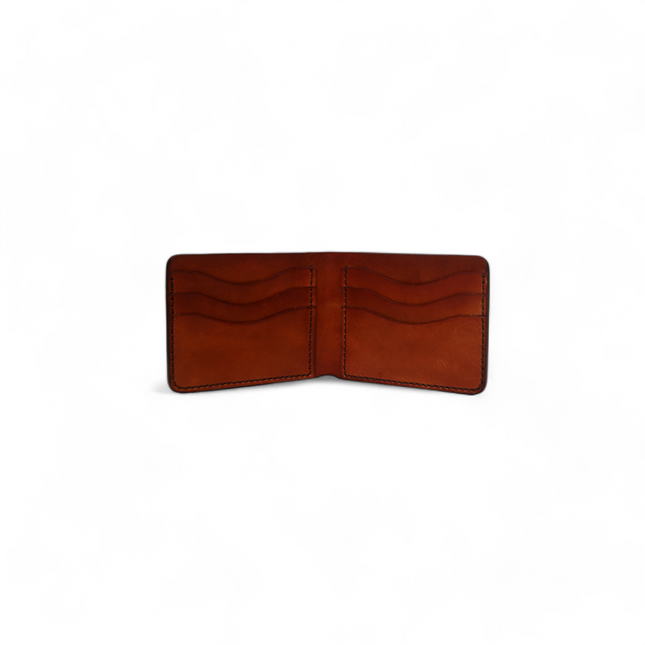 A tan leather wallet with a patina finish that highlights its unique character over time. This wallet offers a classic design with multiple card slots, a cash compartment, and refined stitching. The patina adds a touch of vintage charm, making it both stylish and enduring.