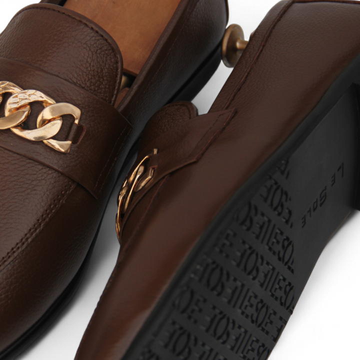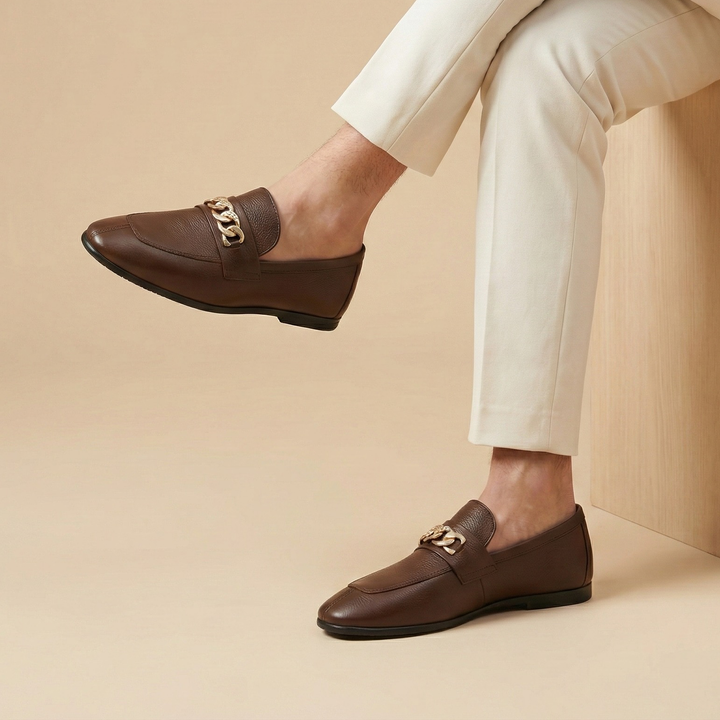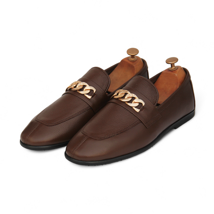 Le Combo brings a bold touch to classic elegance. Crafted from premium brown leather and finished with a striking gold chain detail, these shoes offer both style and comfort for any occasion. Perfect for formal, festive, and smart-casual looks.