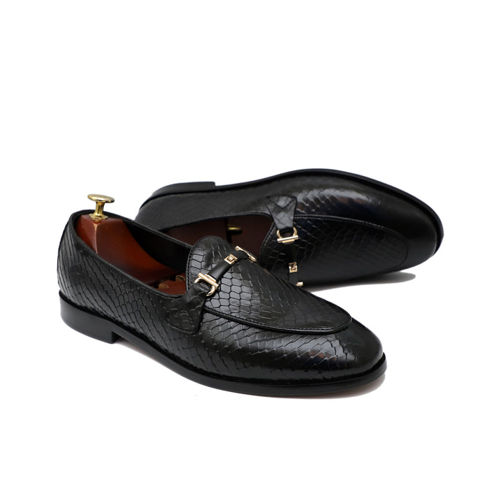 Black textured leather adorned with golden and black buckle as round shaped slip-ons. Leather Lining on the inside with an all leather cushioned foot bed. Each pair is carefully hand crafted using finest techniques that symbolises the craftsmanship of our brand.