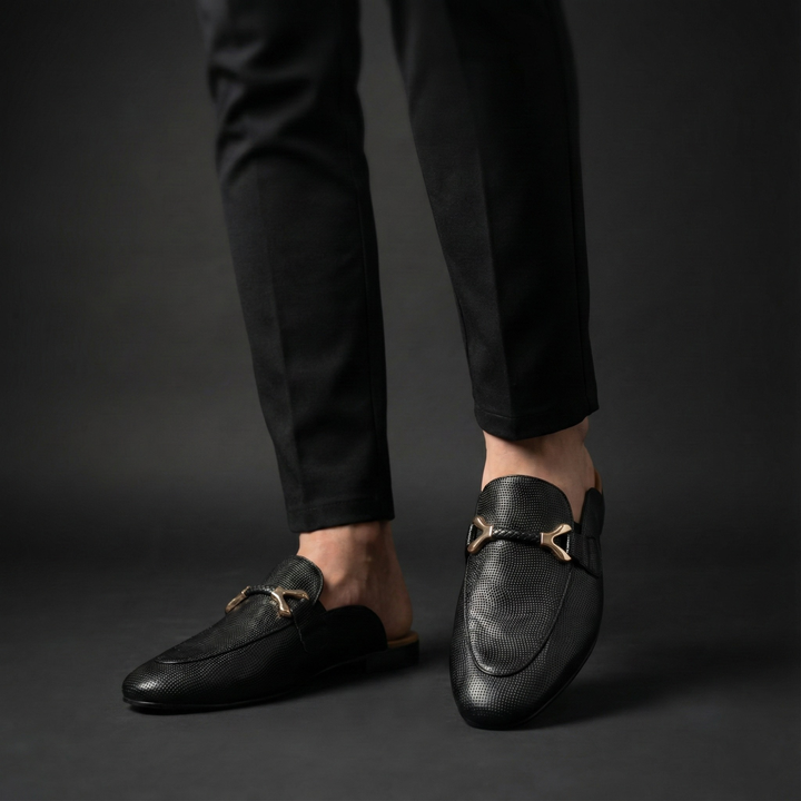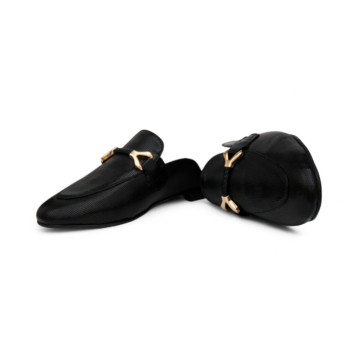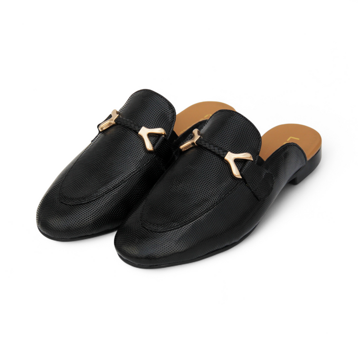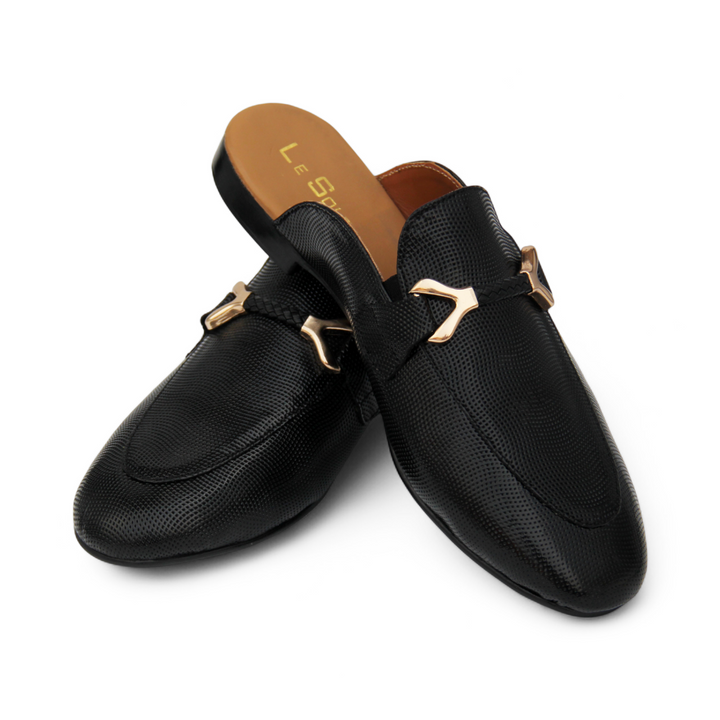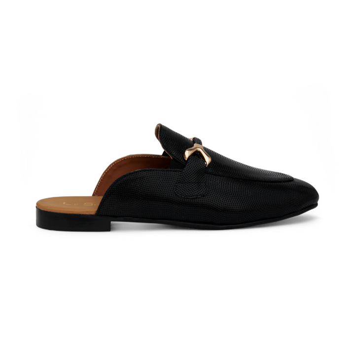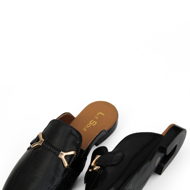 The Le Sole Black Leather Mules are stylish and comfortable shoes for everyday wear. Made from soft black leather with a gold buckle detail, they are easy to slip on and look great with any outfit.