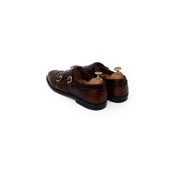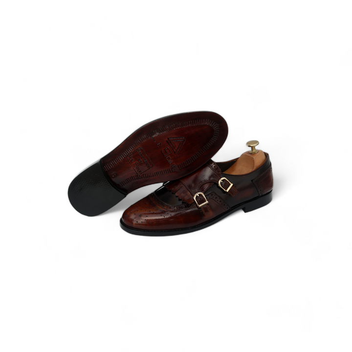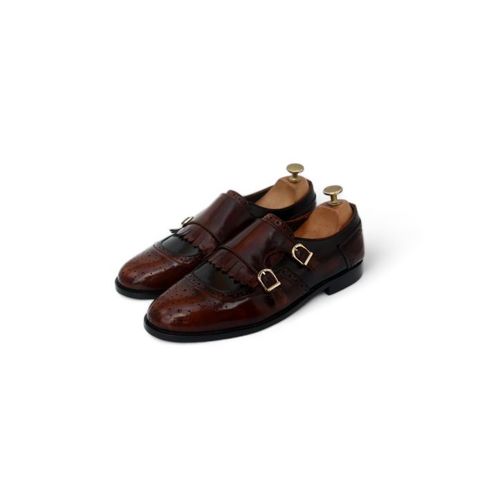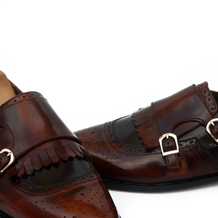 Two Tone Leather with double monk and fringes stitched as round shaped slip-ons. Leather Lining on the inside with an all leather cushioned foot bed.