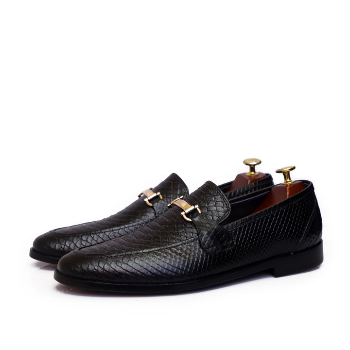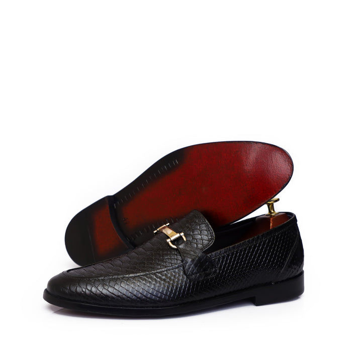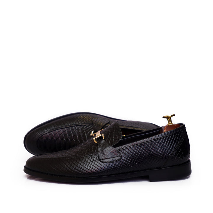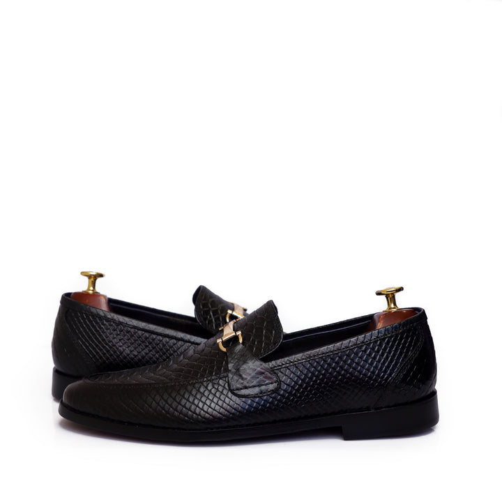 Black polished Printed Leather with Golden Buckle on top stitched as round shaped slip-ons. Leather Lining on the inside with an all leather cushioned foot bed. Each pair is carefully hand crafted using finest techniques that symbolises the craftsmanship of our brand.