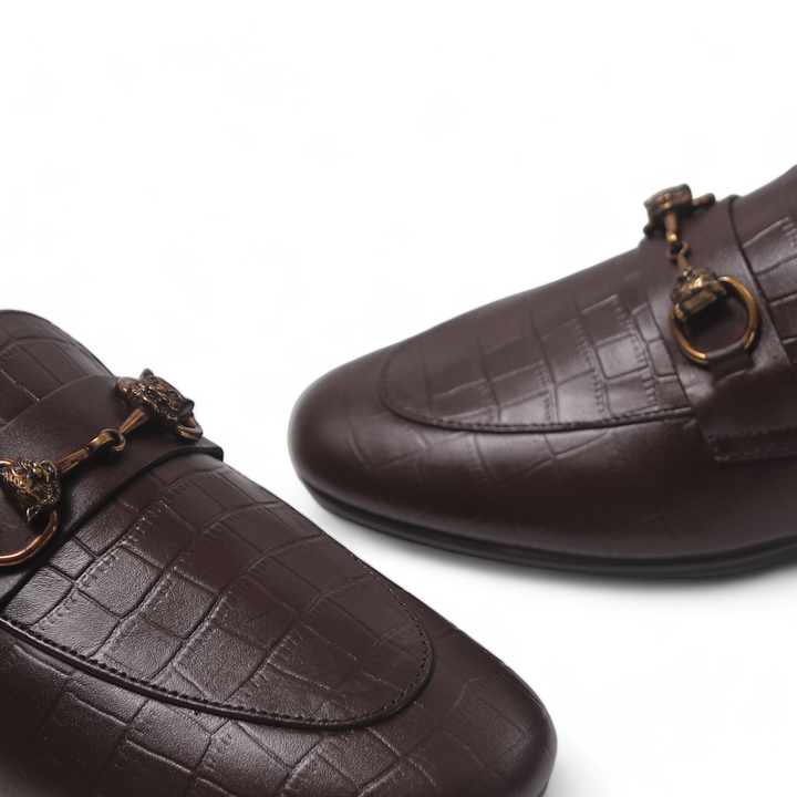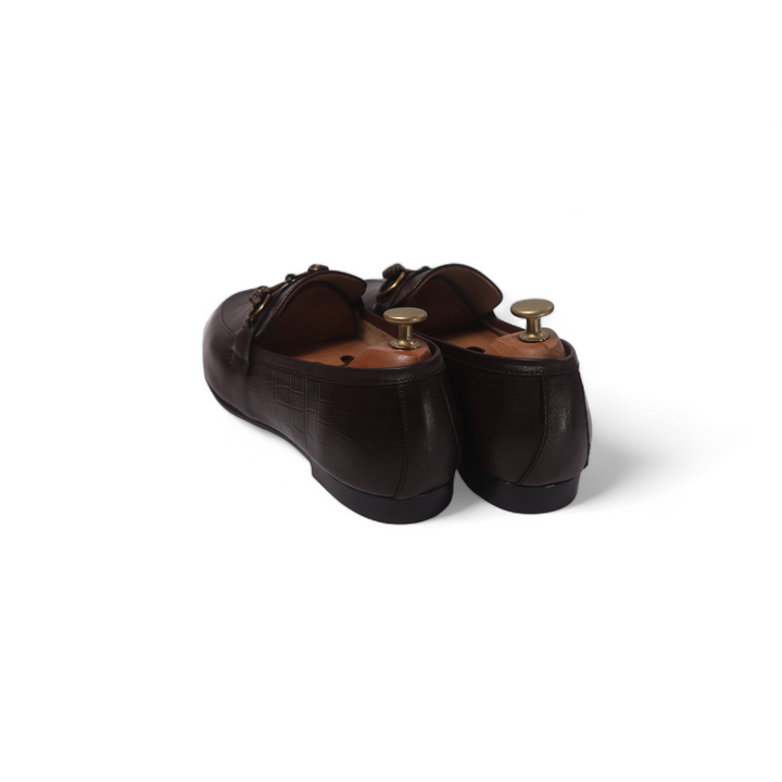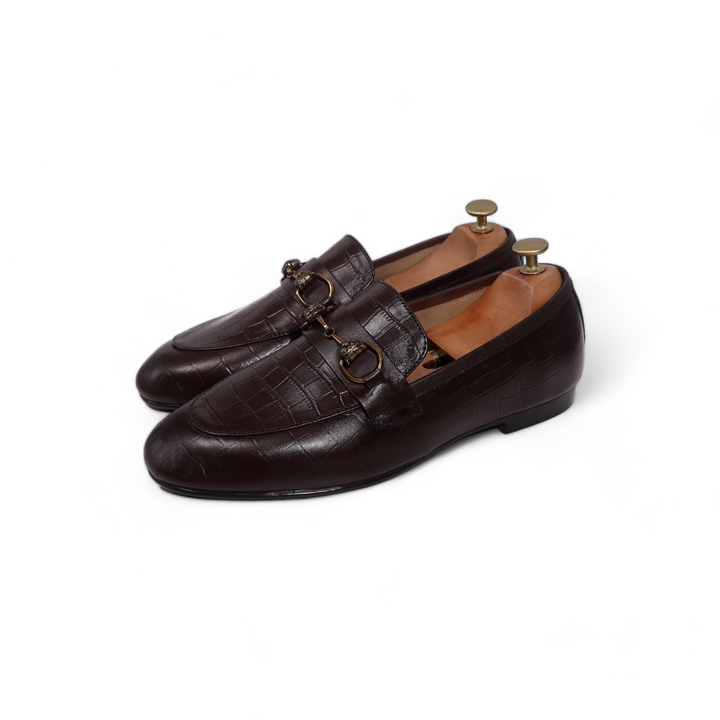 Brown shoes with a printed leather, featuring a durable rubber sole for comfort and grip. The distinctive printed adds a touch of luxury and texture, elevating the classic design. Perfect for adding a stylish edge to both formal and casual outfits, these shoes combine sophistication with practicality.