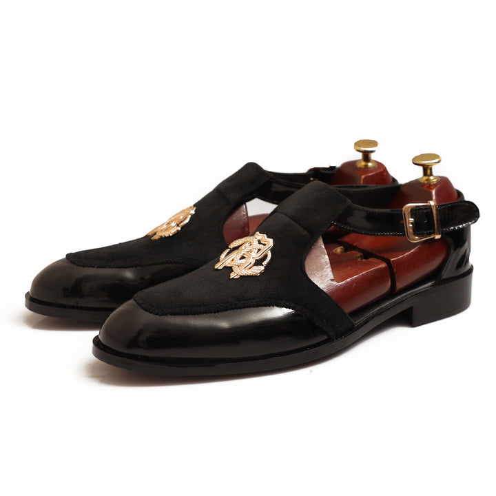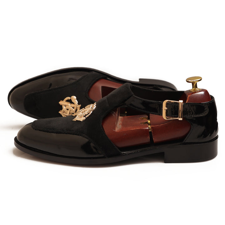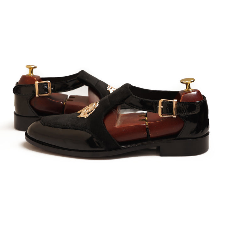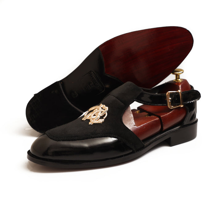 Black Patent and Suede Leather Upper adorned with golden buckle as round shaped slip-ons. Leather Lining on the inside with an all leather cushioned foot bed. Each pair is carefully hand crafted using finest techniques that symbolises the craftsmanship of our brand.