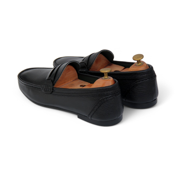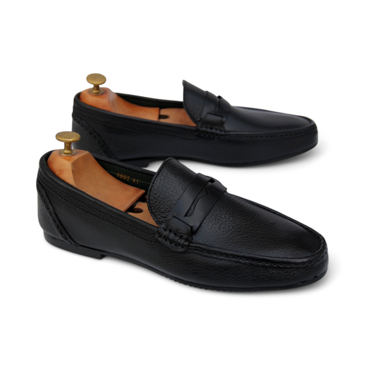 Loafer shoes with a leather upper, leather lining, and rubber sole offer a perfect blend of style, comfort, and durability. The leather upper provides a sleek and polished appearance, ensuring a sophisticated and timeless look suitable for both formal and casual occasions. The leather lining enhances breathability and comfort, allowing for a soft and luxurious feel against the skin. Meanwhile, the rubber sole ensures excellent grip, flexibility, and shock absorption, making these loafers ideal for all-day wear. Whether paired with tailored trousers or smart-casual outfits, these loafers offer a refined yet practical footwear choice.