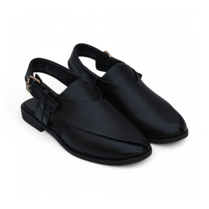 A traditional leather Peshawari chappal, known for its comfort and durability, crafted from high-quality leather. This iconic footwear features a sturdy sole and a broad strap design that wraps around the foot, providing a secure fit. The open-toe style allows for breathability, making it ideal for warm climates. The Peshawari chappal is a blend of cultural heritage and timeless style, perfect for both casual and formal wear. Its hand-stitched detailing adds a touch of craftsmanship, making it a classic addition to any wardrobe.