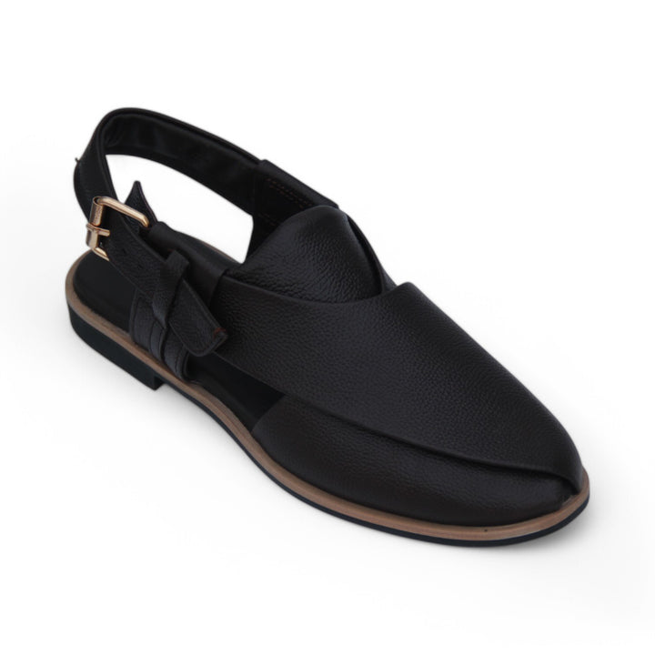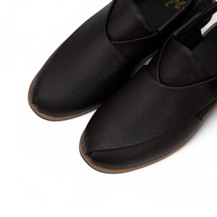 A traditional leather Peshawari chappal, known for its comfort and durability, crafted from high-quality leather. This iconic footwear features a sturdy sole and a broad strap design that wraps around the foot, providing a secure fit. The open-toe style allows for breathability, making it ideal for warm climates. The Peshawari chappal is a blend of cultural heritage and timeless style, perfect for both casual and formal wear. Its hand-stitched detailing adds a touch of craftsmanship, making it a classic addition to any wardrobe.