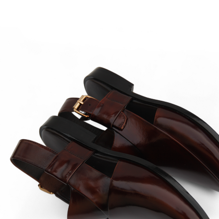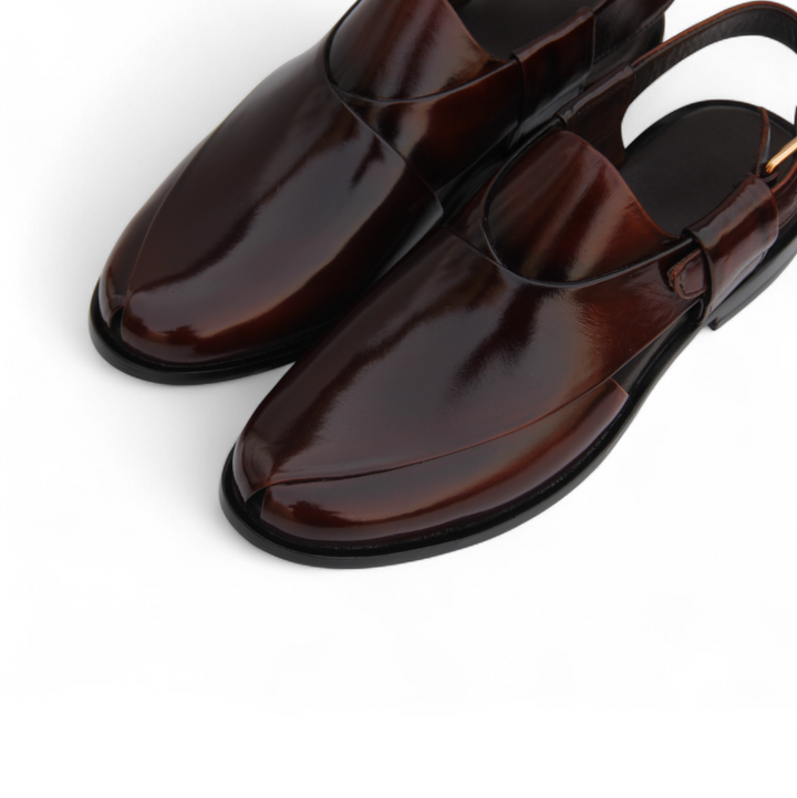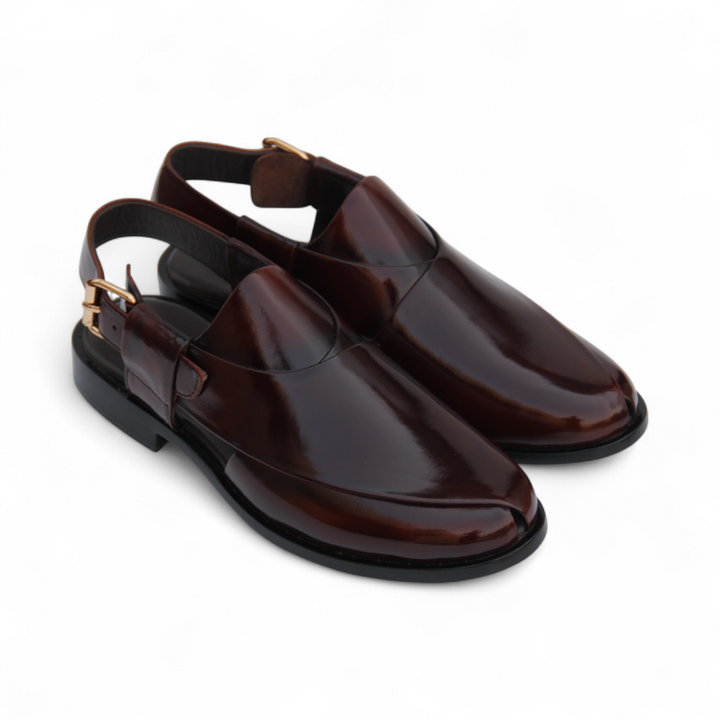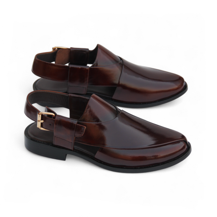 A traditional leather Peshawari chappal, known for its comfort and durability, crafted from high-quality leather. This iconic footwear features a sturdy sole and a broad strap design that wraps around the foot, providing a secure fit. The open-toe style allows for breathability, making it ideal for warm climates. The Peshawari chappal is a blend of cultural heritage and timeless style, perfect for both casual and formal wear. Its hand-stitched detailing adds a touch of craftsmanship, making it a classic addition to any wardrobe.