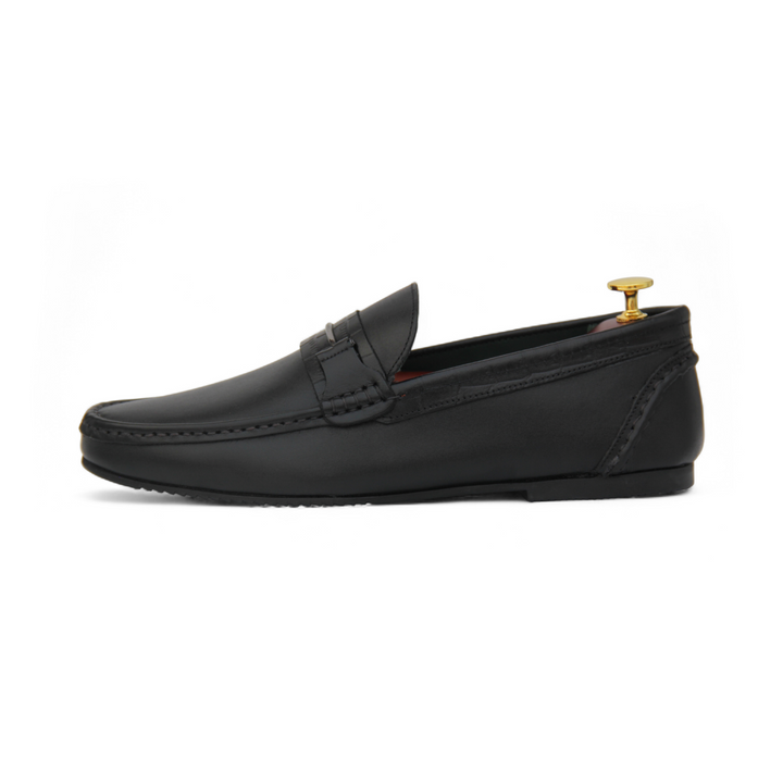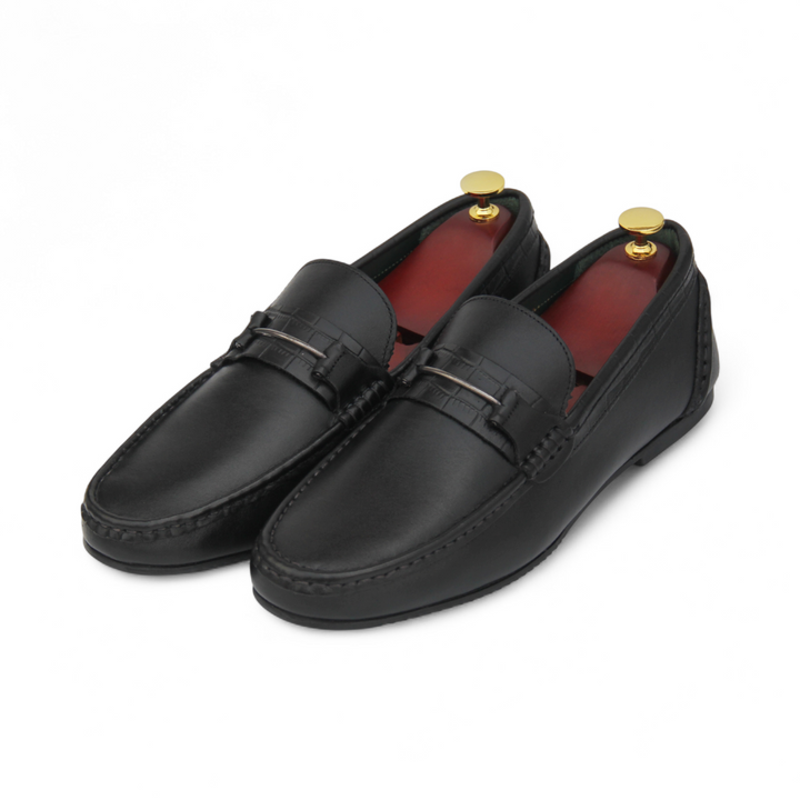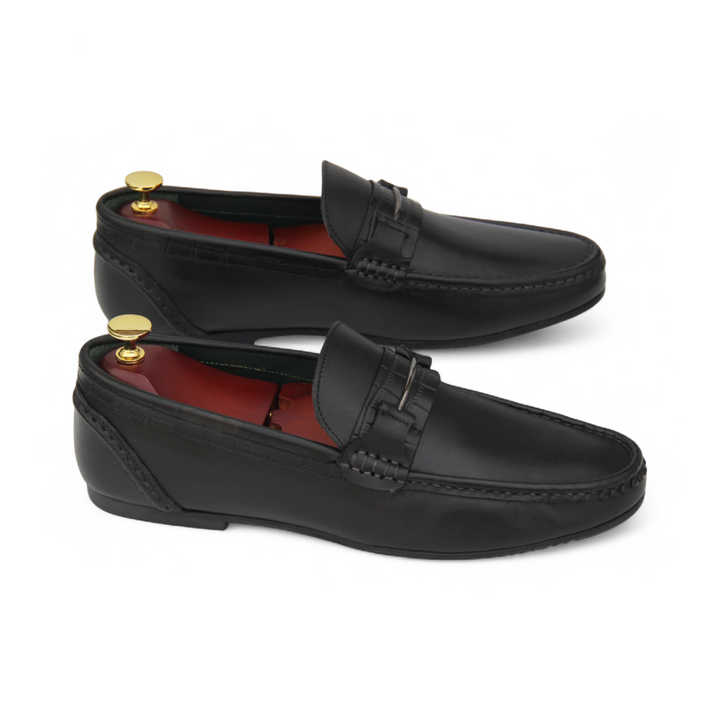 Elevate your style with the Le Sole Black Leather Loafers, crafted from premium genuine leather for a sleek, timeless look. Featuring a smooth black finish, metal bit detail, and cushioned red-lined interior, these loafers blend luxury with all-day comfort. Perfect for both formal and casual wear.