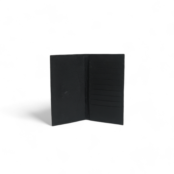 This black leather wallet is crafted from soft, mild leather, offering a sleek and minimalist design. The exterior has a smooth, supple texture that feels comfortable to the touch, with a slight sheen that enhances its elegant appearance. Inside, the wallet features multiple compartments for cards, a spacious billfold section, and a secure coin pocket. The stitching is clean and discreet, complementing the overall refined look. It's a perfect blend of style and functionality, making it an ideal accessory for both casual and formal occasions.