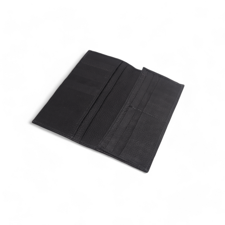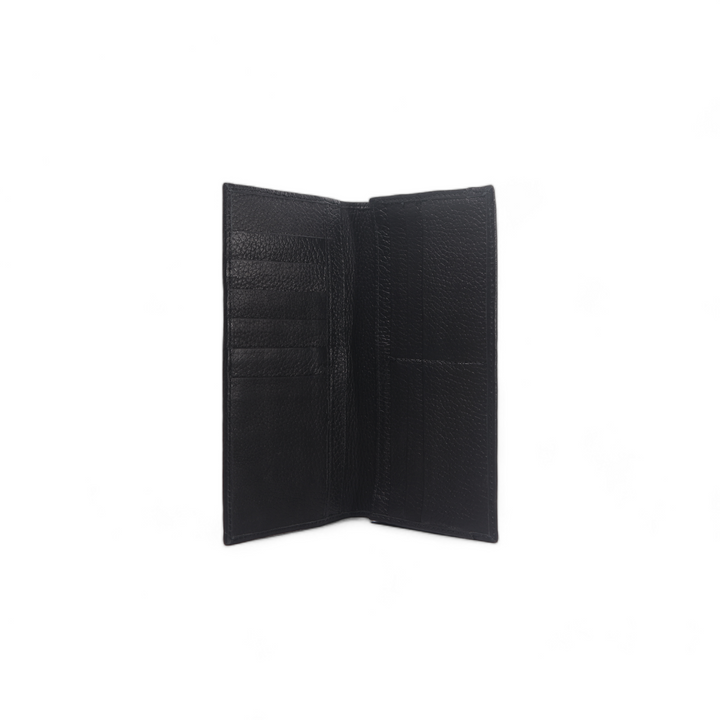A sleek black leather wallet with a slim design, featuring multiple card slots, a cash compartment, and a secure ID window. Crafted from premium leather with finely stitched edges, it's durable and stylish for any occasion.